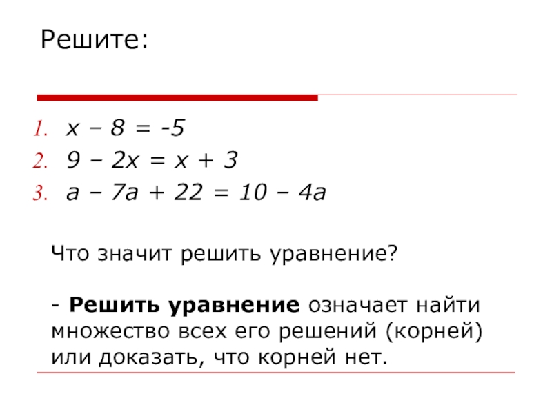 - Решить уравнение означает найти множество всех его решений (корней) или доказать, что корней нет.