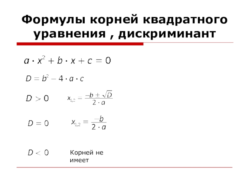 Слайд 12Формулы корней квадратного уравнения , дискриминант