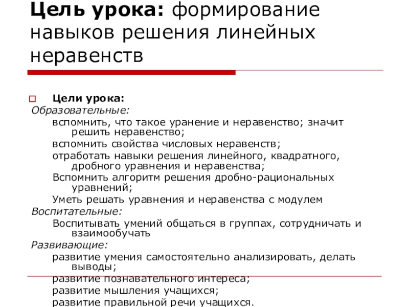 Слайд 2Цель урока: формирование навыков решения линейных неравенств