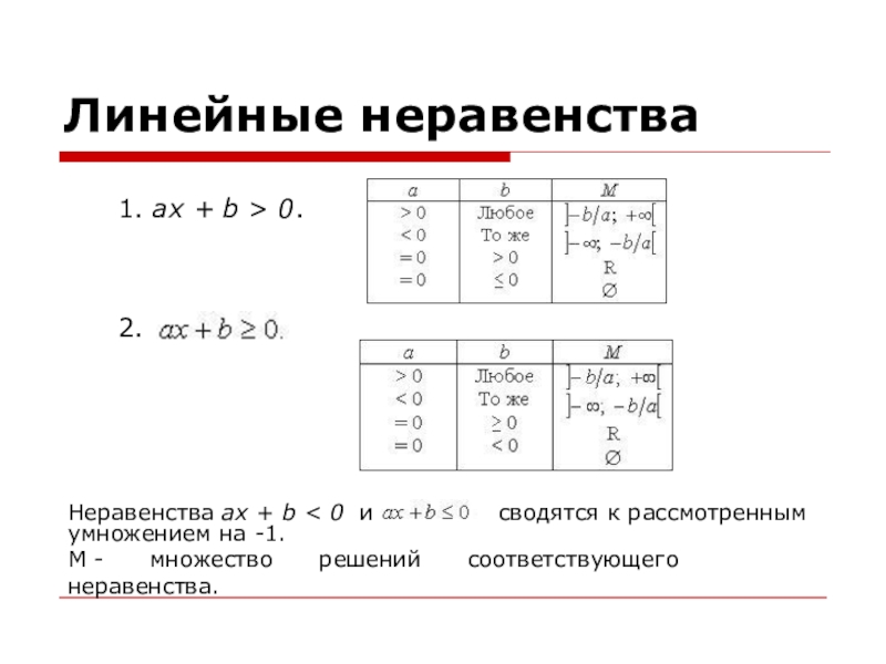 Неравенства ax + b < 0 и сводятся к рассмотренным умножением на -1.