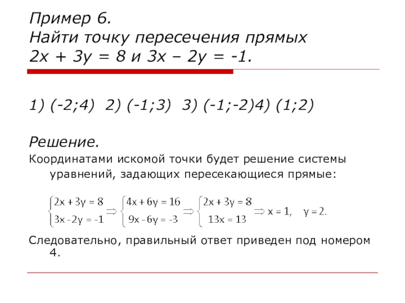 Координатами искомой точки будет решение системы уравнений, задающих пересекающиеся прямые: