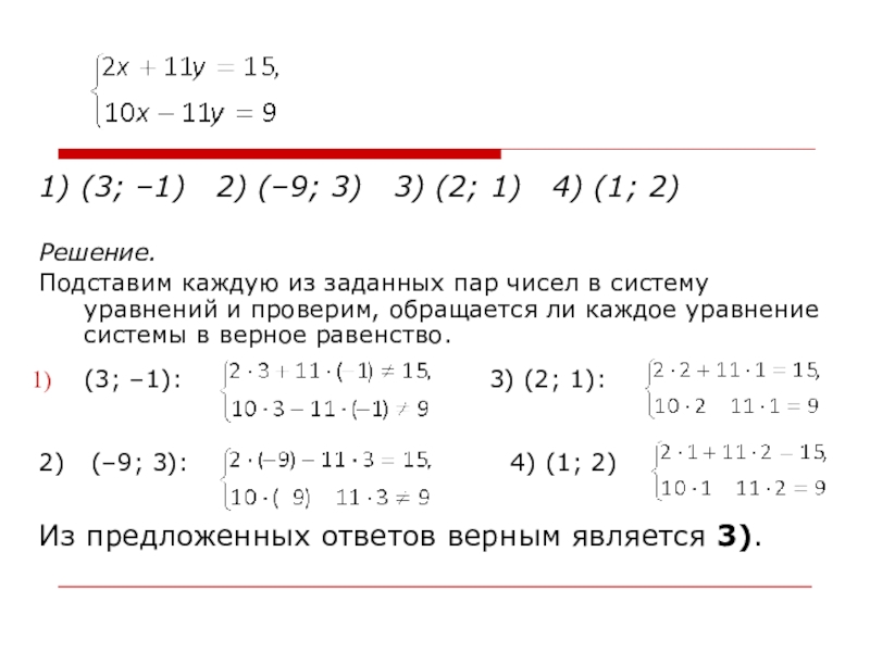 Подставим каждую из заданных пар чисел в систему уравнений и проверим, обращается ли каждое уравнение системы в верное равенство.