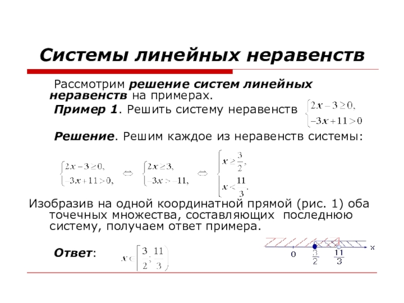 Изобразив на одной координатной прямой (рис. 1) оба точечных множества, составляющих последнюю систему, получаем ответ примера.