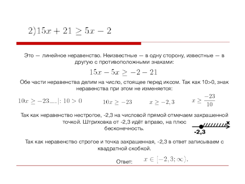 Так как неравенство нестрогое, -2,3 на числовой прямой отмечаем закрашенной точкой. Штриховка от -2,3 идёт вправо, на плюс бесконечность.