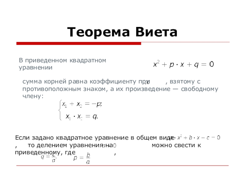 Если задано квадратное уравнение в общем виде , то делением уравнения на можно свести к приведенному, где ,