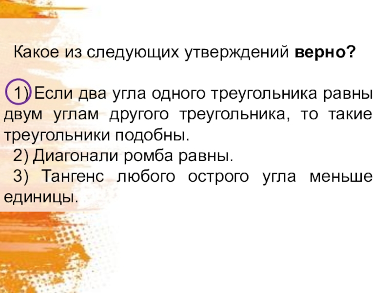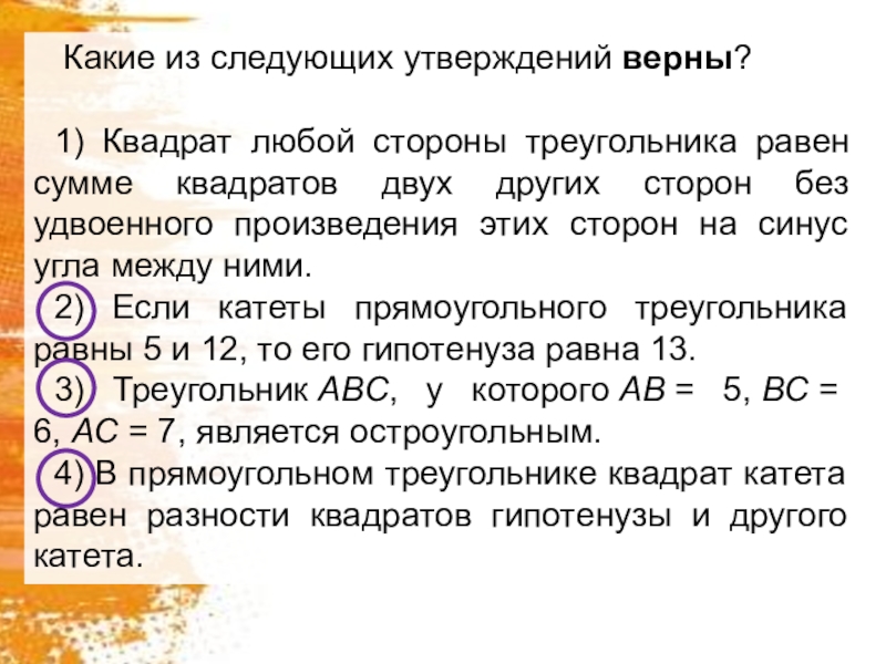 3) Треугольник ABC, у которого AB = 5, BC = 6, AC = 7, является остроугольным.