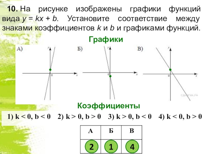 Слайд 510. На рисунке изображены графики функций вида y = kx + b. Установите соответствие между знаками коэффициентов k и b и