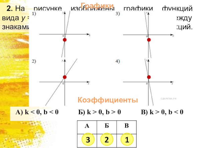 Слайд 32. На рисунке изображены графики функций вида y = kx + b. Установите соответствие между знаками коэффициентов k и b и