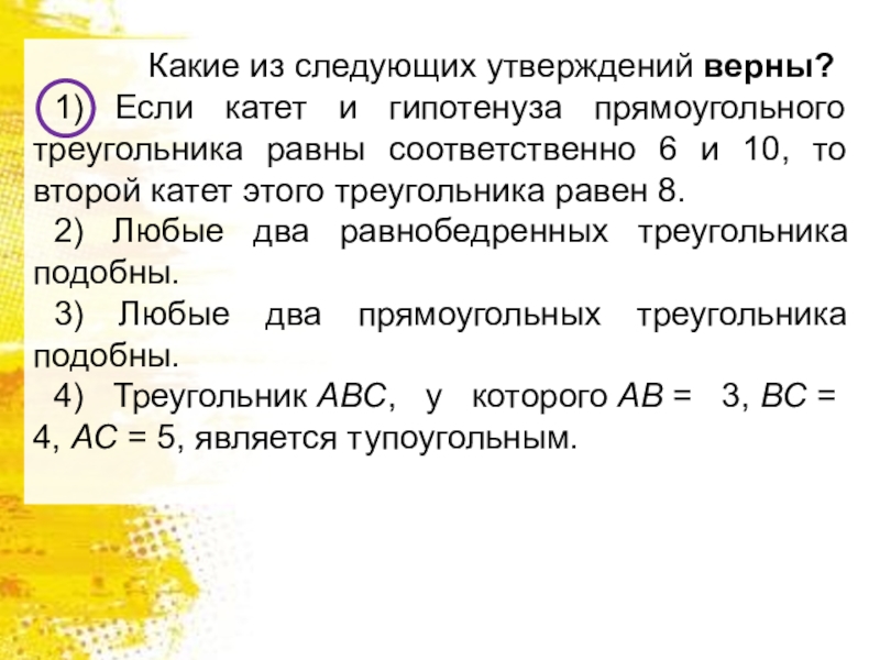 4) Треугольник ABC, у которого AB = 3, BC = 4, AC = 5, является тупоугольным.