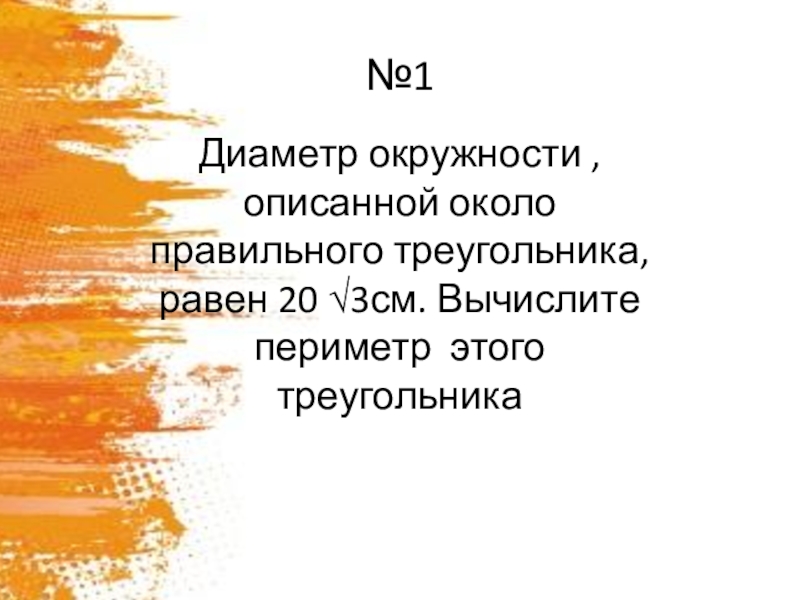 Диаметр окружности , описанной около правильного треугольника, равен 20 √3см.