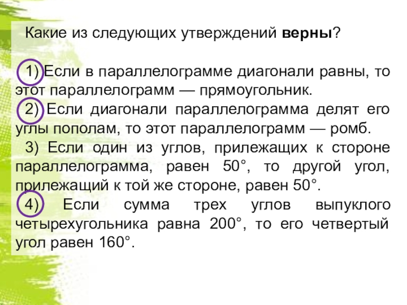 3) Если один из углов, прилежащих к стороне параллелограмма, равен 50°, то другой угол, прилежащий к той же стороне, равен 50°.