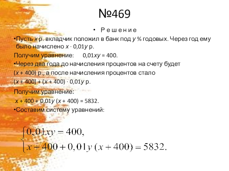 в банк под у % годовых. Через год ему было начислено х · 0,01у р.