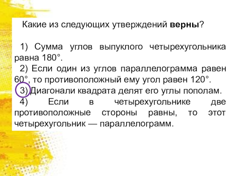 1) Сумма углов выпуклого четырехугольника равна 180°.