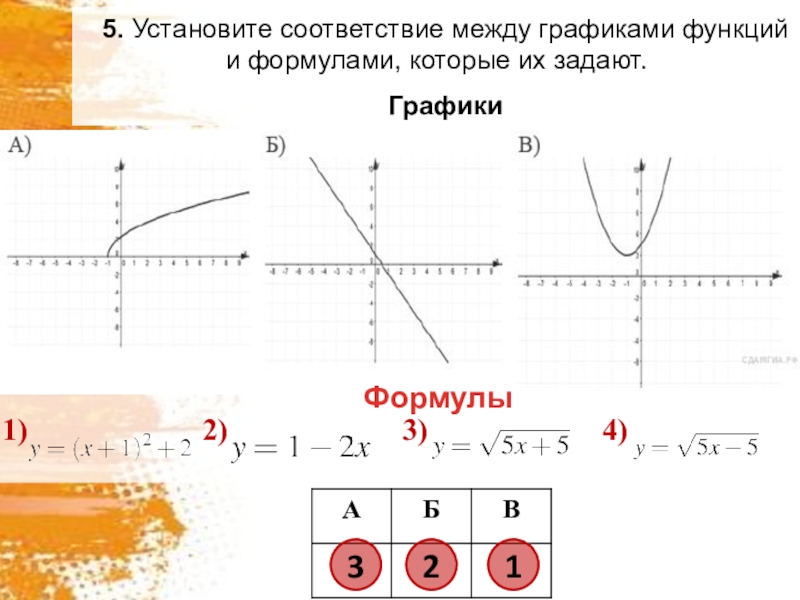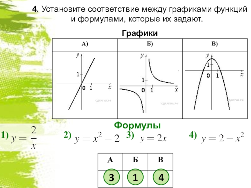 Слайд 44. Установите соответствие между графиками функций и формулами, которые их задают.