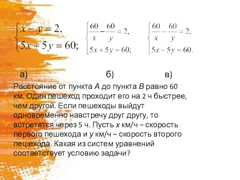 Расстояние от пункта А до пункта В равно 60 км. Один пешеход проходит его на 2 ч быстрее, чем другой. Если пешеходы выйдут одновременно навстречу друг другу, то встретятся через 5 ч. Пусть х км/ч – скорость первого пешехода и у км/ч – скорость второго пешехода. Какая из систем уравнений соответствует условию задачи?