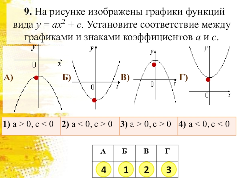 Слайд 109. На рисунке изображены графики функций вида y = ax2 + c. Установите соответствие между графиками и
