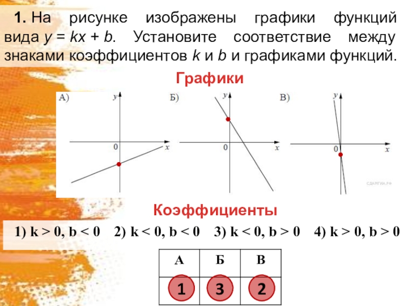 Слайд 111. На рисунке изображены графики функций вида y = kx + b. Установите соответствие между знаками коэффициентов k и b и
