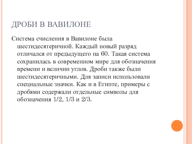 ДРОБИ В ВАВИЛОНЕСистема счисления в Вавилоне была шестидесятеричной. Каждый новый разряд отличался от предыдущего на 60. Такая