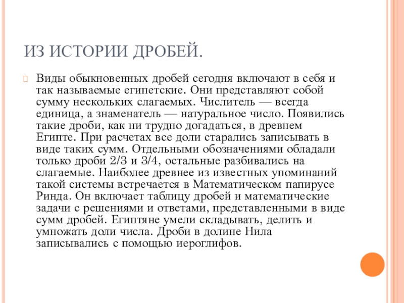 ИЗ ИСТОРИИ ДРОБЕЙ.Виды обыкновенных дробей сегодня включают в себя и так называемые египетские. Они представляют собой сумму
