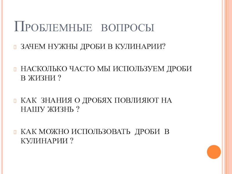 Проблемные вопросыЗАЧЕМ НУЖНЫ ДРОБИ В КУЛИНАРИИ?НАСКОЛЬКО ЧАСТО МЫ ИСПОЛЬЗУЕМ ДРОБИ В ЖИЗНИ ?КАК ЗНАНИЯ О ДРОБЯХ ПОВЛИЯЮТ НА НАШУ ЖИЗНЬ ? КАК МОЖНО ИСПОЛЬЗОВАТЬ ДРОБИ В КУЛИНАРИИ ?