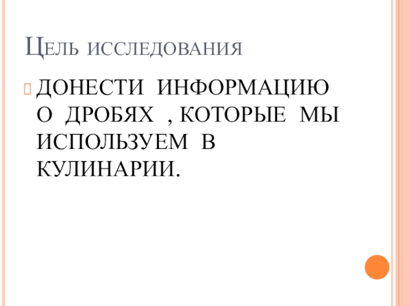 Цель исследования ДОНЕСТИ ИНФОРМАЦИЮ О ДРОБЯХ , КОТОРЫЕ МЫ ИСПОЛЬЗУЕМ В КУЛИНАРИИ.