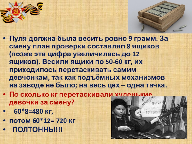 составлял 8 ящиков (позже эта цифра увеличилась до 12 ящиков). Весили ящики по 50-60 кг, их приходилось перетаскивать самим девчонкам, так как подъёмных механизмов на заводе не было; на весь цех – одна тачка.