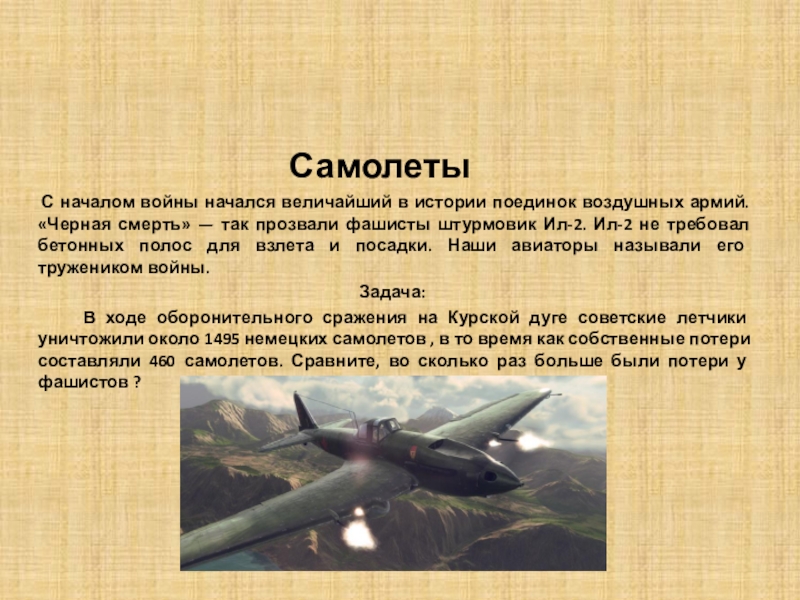 воздушных армий.«Черная смерть» — так прозвали фашисты штурмовик Ил-2. Ил-2 не требовал бетонных полос для взлета и посадки. Наши авиаторы называли его тружеником войны.