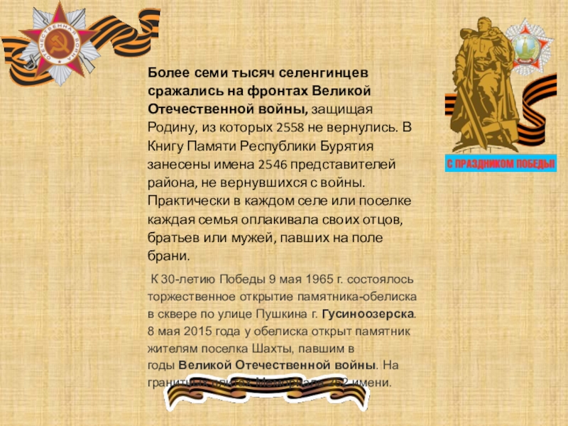 Более семи тысяч селенгинцев сражались на фронтах Великой Отечественной войны, защищая