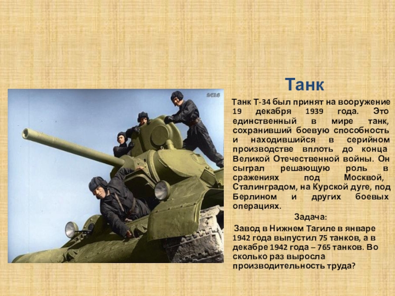 Завод в Нижнем Тагиле в январе 1942 года выпустил 75 танков, а в декабре 1942 года – 765 танков. Во сколько раз выросла производительность труда?