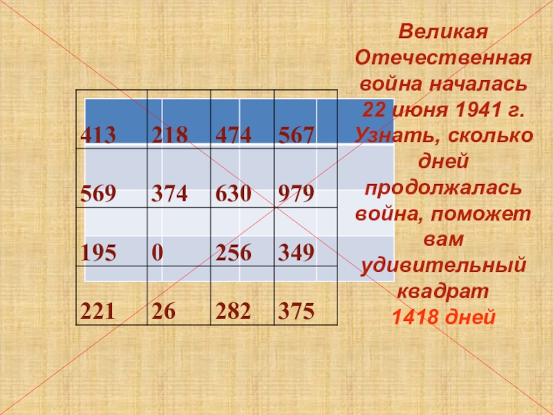 дней длилась эта война , нам поможет этот удивительный квадрат. Выберите из каждой строки и каждого столбца по одному числу, найдите сумму выбранных чисел.