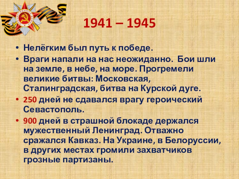 нас неожиданно. Бои шли на земле, в небе, на море. Прогремели великие битвы: Московская, Сталинградская, битва на Курской дуге.