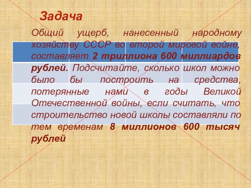 2 триллиона 600 миллиардов рублей. Подсчитайте, сколько школ можно было бы построить на средства, потерянные нами в годы Великой Отечественной войны, если считать, что строительство новой школы составляли по тем временам 8 миллионов 600 тысяч рублей