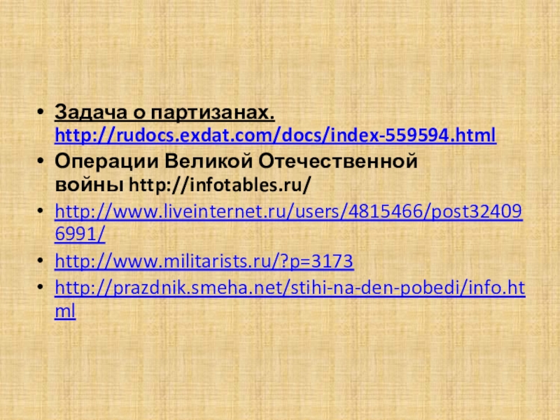 Слайд 46Задача о партизанах. http://rudocs.exdat.com/docs/index-559594.html
