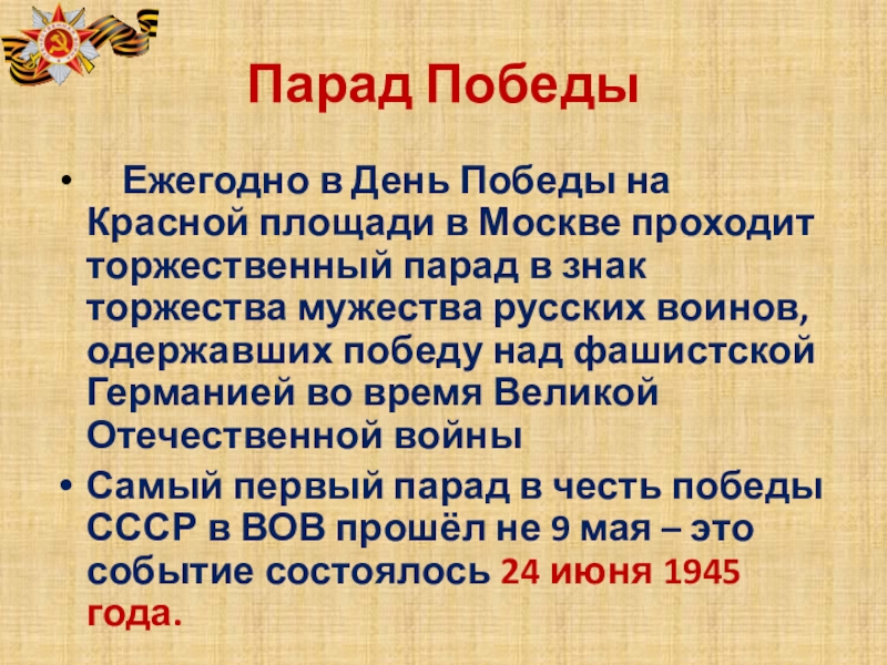 Самый первый парад в честь победы СССР в ВОВ прошёл не 9 мая – это событие состоялось 24 июня 1945 года.