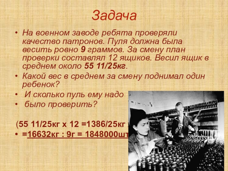 Слайд 14На военном заводе ребята проверяли качество патронов. Пуля должна была весить