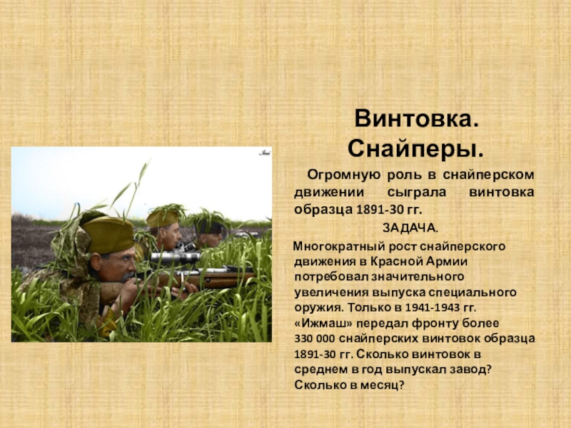 Многократный рост снайперского движения в Красной Армии потребовал значительного увеличения выпуска специального оружия. Только в 1941-1943 гг. «Ижмаш» передал фронту более 330 000 снайперских винтовок образца 1891-30 гг. Сколько винтовок в среднем в год выпускал завод? Сколько в месяц?