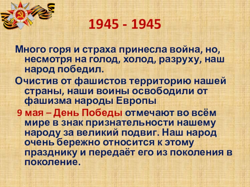 9 мая – День Победы отмечают во всём мире в знак признательности нашему народу за великий подвиг. Наш народ очень бережно относится к этому празднику и передаёт его из поколения в поколение.