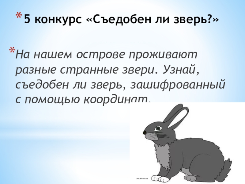 5 конкурс «Съедобен ли зверь?»На нашем острове проживают разные странные звери. Узнай, съедобен ли зверь, зашифрованный с