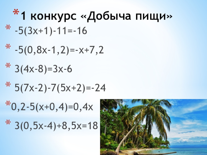 1 конкурс «Добыча пищи» -5(3х+1)-11=-16 -5(0,8х-1,2)=-х+7,2 3(4х-8)=3х-6 5(7х-2)-7(5х+2)=-240,2-5(х+0,4)=0,4х 3(0,5х-4)+8,5х=18