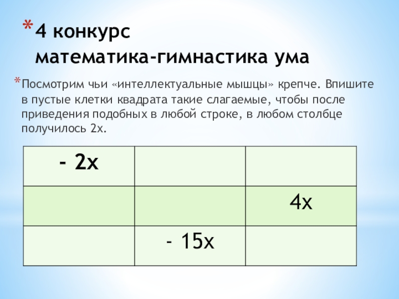 4 конкурс  математика-гимнастика умаПосмотрим чьи «интеллектуальные мышцы» крепче. Впишите в пустые клетки квадрата такие слагаемые, чтобы
