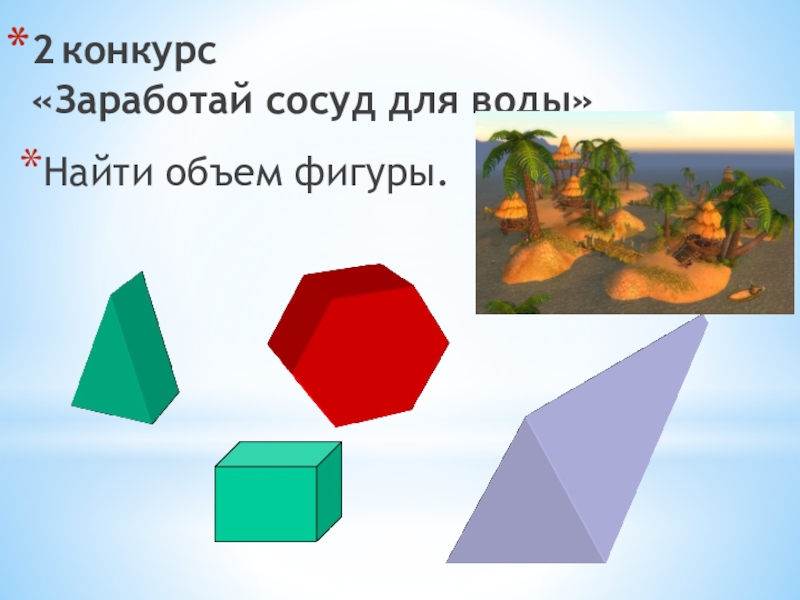 2 конкурс  «Заработай сосуд для воды»Найти объем фигуры.