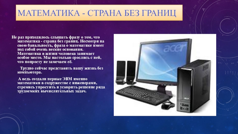 техники. Программы – это инструкции для работы ЭВМ. Но пишутся они с использованием довольно сложных математических алгоритмов на специфических языках программирования. Это чистая математика, мир абстрактных символов и формул. Все программы, созданные как для персональных компьютеров, так и для сложного промышленного оборудования имеют в своей основе математические символы и формулы.