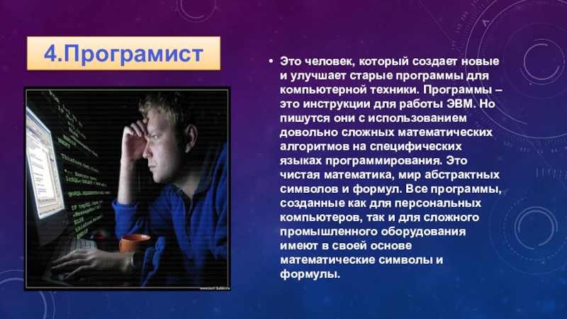 Слайд 17Это человек, который создает новые и улучшает старые программы для компьютерной