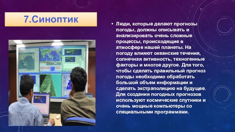 Слайд 20Люди, которые делают прогнозы погоды, должны описывать и анализировать очень сложные