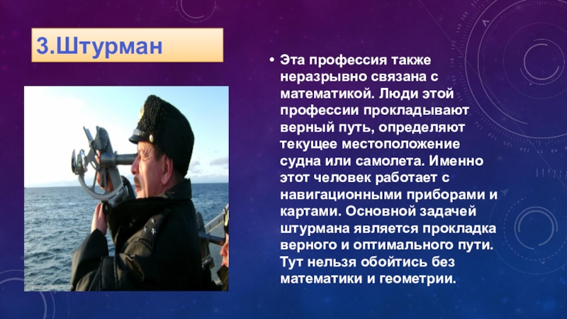 верный путь, определяют текущее местоположение судна или самолета. Именно этот человек работает с навигационными приборами и картами. Основной задачей штурмана является прокладка верного и оптимального пути. Тут нельзя обойтись без математики и геометрии.