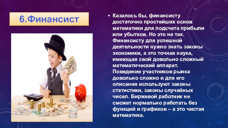 Слайд 19Казалось бы, финансисту достаточно простейших основ математики для подсчета прибыли или
