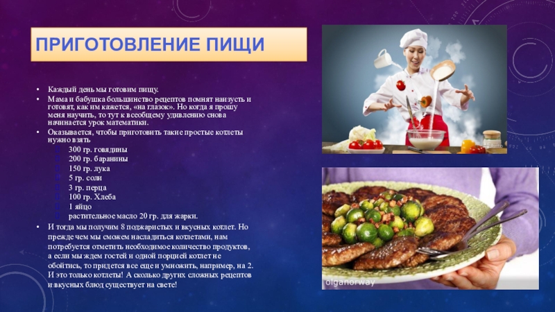 помнят наизусть и готовят, как им кажется, «на глазок». Но когда я прошу меня научить, то тут к всеобщему удивлению снова начинается урок математики.