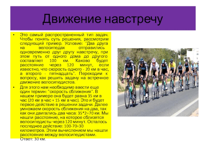 следующий пример. Условие: "Два друга на велосипедах отправились одновременно друг другу навстречу, при этом путь от одного дома до другого составляет 100 км. Каково будет расстояние через 120 минут, если известно, что скорость одного - 20 км в час, а второго - пятнадцать". Переходим к вопросу, как решить задачу на встречное движение велосипедистов.