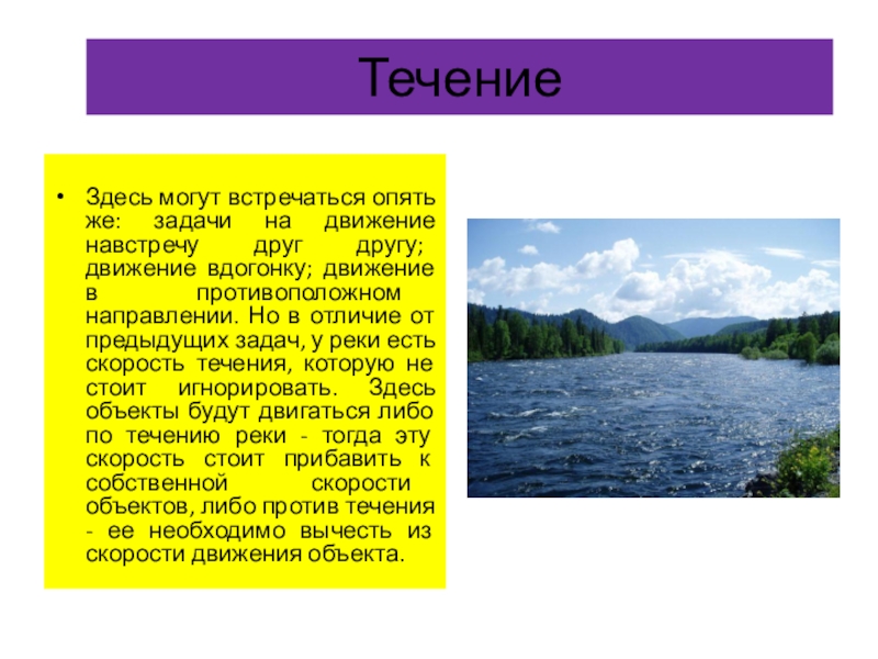 другу; движение вдогонку; движение в противоположном направлении. Но в отличие от предыдущих задач, у реки есть скорость течения, которую не стоит игнорировать. Здесь объекты будут двигаться либо по течению реки - тогда эту скорость стоит прибавить к собственной скорости объектов, либо против течения - ее необходимо вычесть из скорости движения объекта.