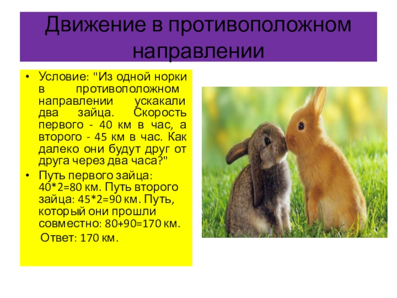 Условие: "Из одной норки в противоположном направлении ускакали два зайца.